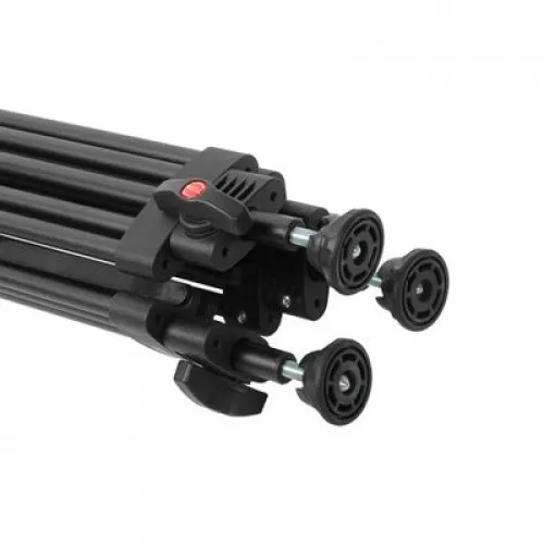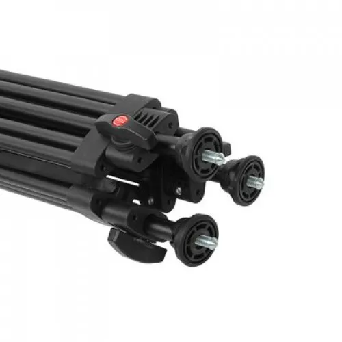 Алюминиевый трипод штатива представляет собой 3-секционную рамочную конструкцию с ногами из легких трубок ?18 и 14 мм. Секции опор независимо выдвигаются и фиксируются винтовыми зажимами, что дает возможность устанавливать штатив на неровной поверхности. Нижние секции ног оканчиваются винтовой резьбой с шипами, на которые накручиваются резиновые опоры с шарнирной базой для контакта с поверхностью. Резиновые опоры обеспечивают устойчивое сцепление с гладким полом, а шипы – с грунтом. Высота штатива регулируется от 82 до 176 см, в сложенном виде длина штатива – 84 см.