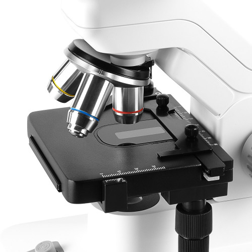 В комплекте микроскопа три объектива высокого разрешения 4х, 10х и 40х позволяющие получать резкое изображение с правильной цветопередачей и минимальными искажениями. Линзы объективов изготовлены высококачественных оптических стекол, объектив 40х оснащен подпружиненной оправой для предотвращения повреждения объектива и образца при фокусировке. Все объективы установлены на револьверном устройстве, позволяющем быстро переходить к различным увеличениям.