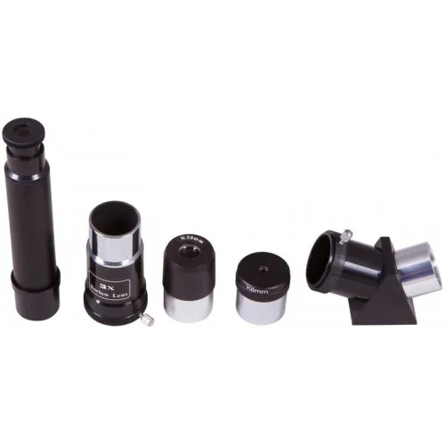 В комплект поставки входит диагональная призма, она строит прямое (неперевернутое) изображение. Благодаря этому телескоп удобен и для наземных наблюдений – он может служить мощной зрительной трубой. В комплекте также идут два окуляра 67x и 20x, линза Барлоу 3x и солнечный фильтр. Максимальное полезное увеличение телескопа составляет 140x. Удобный оптический искатель 5x24 позволяет быстро найти объект наблюдения на ночном небе. С аксессуарами «из коробки» можно получить увеличение 200x.