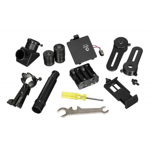 Sky-Watcher MAK 70 mini Virtuoso GTi дополняется следующими аксессуарами для наблюдений: двумя окулярами PHOTO с фокусным расстоянием 10 мм и 20 мм, диагональным зеркалом 90°, адаптером для смартфона (для любительской съемки фото и видео), алюминиевой треногой с лотком для аксессуаров. Для работы электронной части телескопа потребуется подключение к источнику постоянного тока. Прибор можно использовать с настольной подставкой или установить на треногу.
