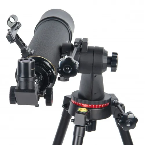 Высота металлического штатива-треноги регулируется от 72 см до 124 см за счет телескопической конструкции с винтовыми фиксаторами. Пластиковые опоры на ножках не позволяют штативу царапать поверхность пола. При использовании телескопа в «полевых» условиях пластиковые опоры выкручиваются вверх и штатив устанавливается на неровную поверхность на «шипах». Для точного выравнивания штатива сверху на корпусе размещен крупный пузырьковый уровень диаметром 25 мм, а для придания устойчивости крепится растяжка с лотком, служащая одновременно полочкой для окуляров.