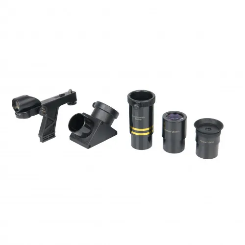 В комплект входят окуляры PL10 (симметричный окуляр Плёсл) и К25 (конструкция Кельнер) с просветленной оптикой FMC. Замена окуляров ведет к изменению кратности увеличения – 60х и 24х соответственно. Используя линзу Барлоу с трехкратным увеличением, можно кратно изменить увеличение до 180х, 72х.